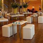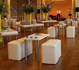 Stackable chairs, like the ones at hotels, are generally comfortable, but may not be the look you want. In that case, you can cover them. Covers help transform a space by covering some of the floor, making a room look fuller, and visually softening the space. Another option is the spandex covered chair, which makes the perfect hi-tech statement.