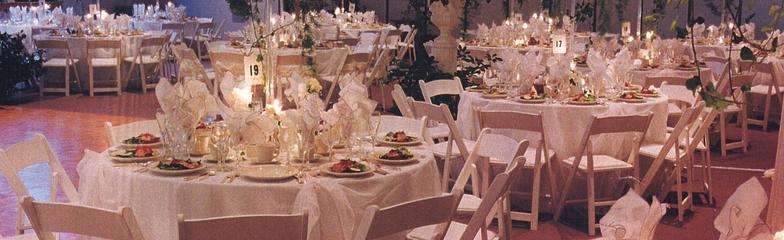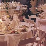 Both wooden and plastic folding chairs are available and are usually more reasonable in cost. The wooden folding chairs come in natural, black, and white, the plastic in black and white only. Both types can be covered. The plastic chairs do well for outdoor casual functions and are actually rather comfortable.